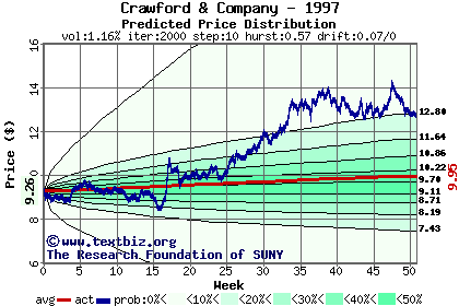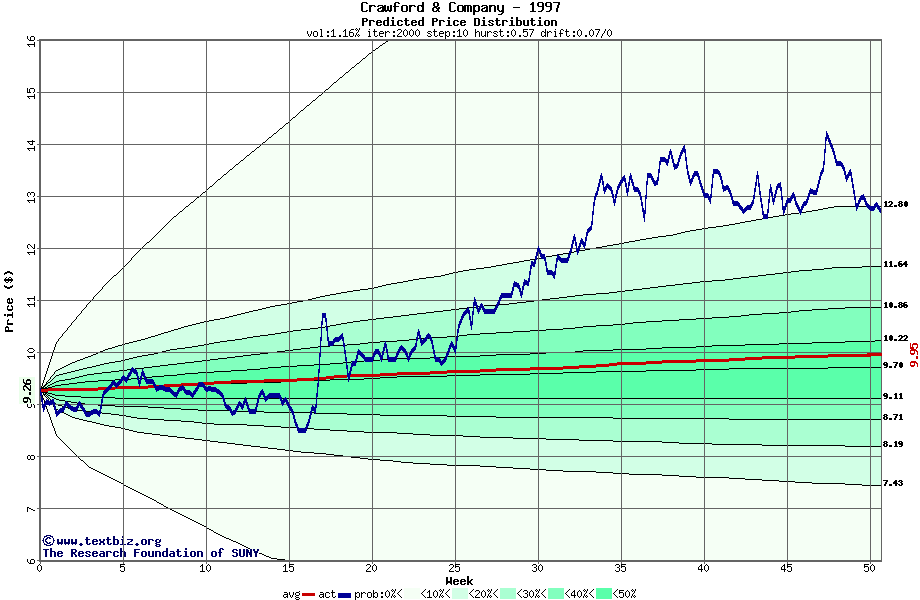 The following graph plots the year-to-date performance of the stock for 1997 compared to the probability calculated by a random walk model.