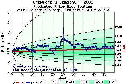 The high to date and low to date prices of the stock plotted against a random walk model for 2001 (what's this?).