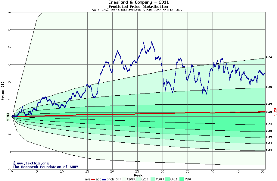 The high to date and low to date prices of the stock plotted against a random walk model for 2011 (what's this?).