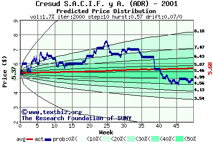 The high to date and low to date prices of the stock plotted against a random walk model for 2001 (what's this?).