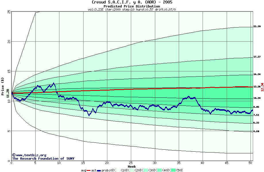 The following graph plots the year-to-date performance of the stock for 2005 compared to the probability calculated by a random walk model.