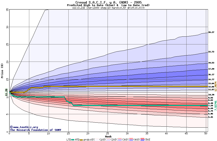 The high to date and low to date prices of the stock plotted against a random walk model for 2005 (what's this?).