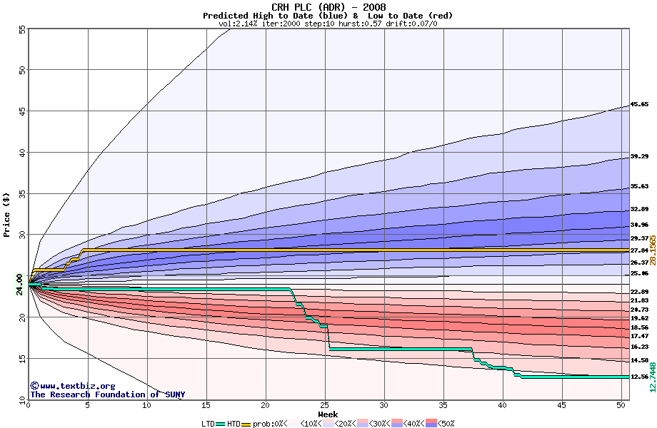 The high to date and low to date prices of the stock plotted against a random walk model for 2008 (what's this?).