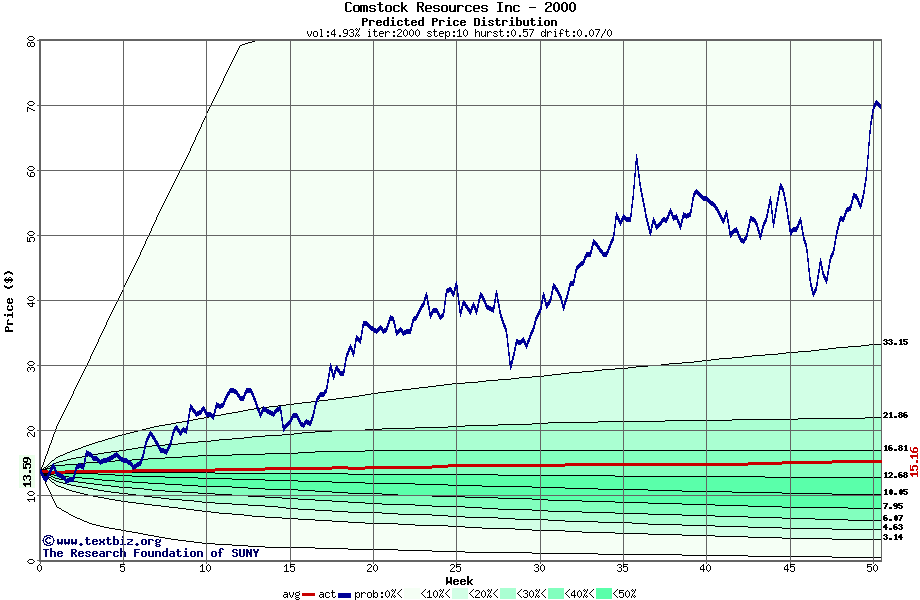 The high to date and low to date prices of the stock plotted against a random walk model for 2000 (what's this?).