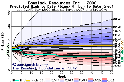 The high to date and low to date prices of the stock plotted against a random walk model for 2006 (what's this?).