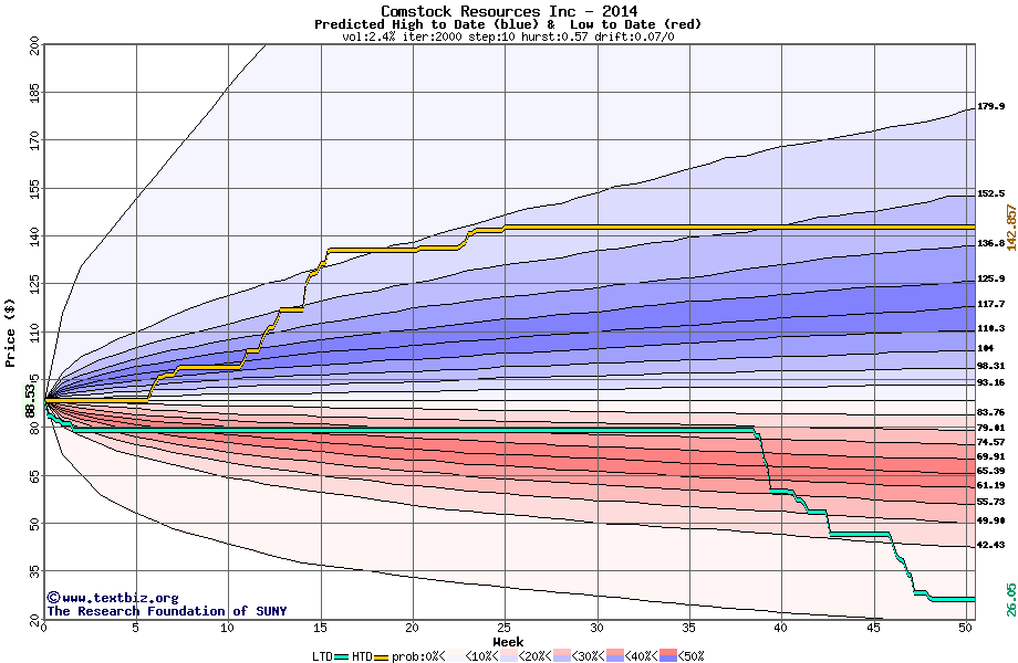 The high to date and low to date prices of the stock plotted against a random walk model for 2014 (what's this?).