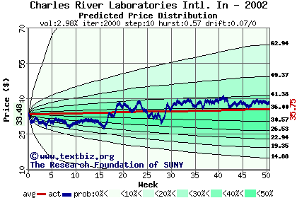 The high to date and low to date prices of the stock plotted against a random walk model for 2002 (what's this?).