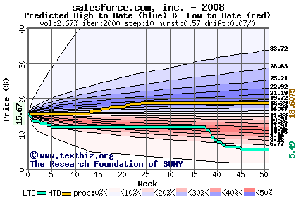 The high to date and low to date prices of the stock plotted against a random walk model for 2008 (what's this?).