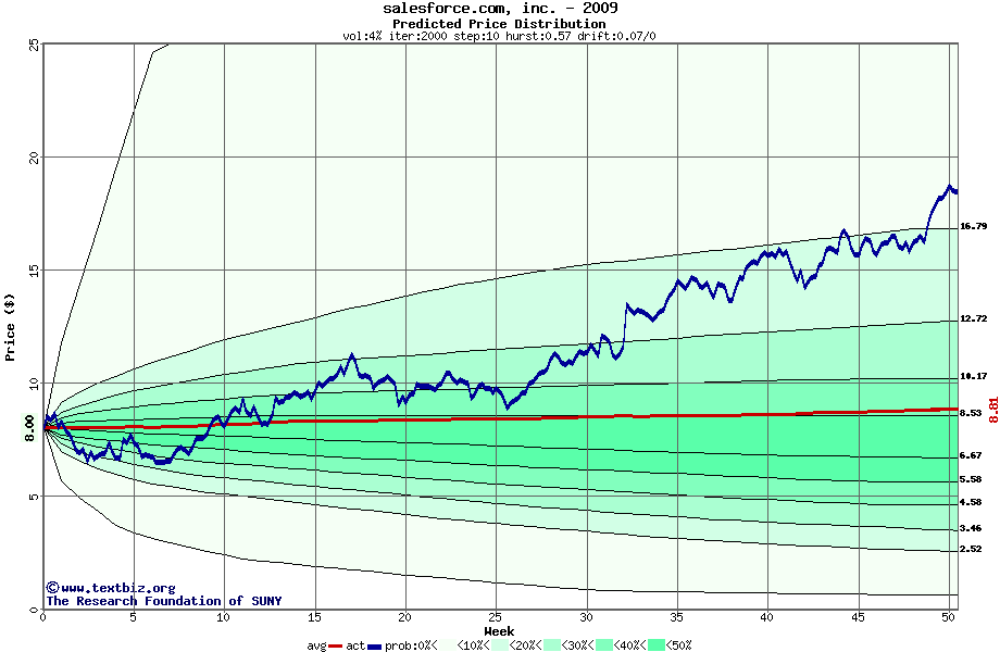 The following graph plots the year-to-date performance of the stock for 2009 compared to the probability calculated by a random walk model.