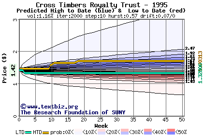 The high to date and low to date prices of the stock plotted against a random walk model for 1995 (what's this?).