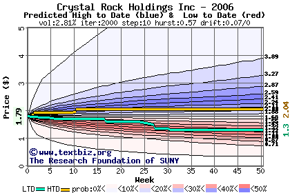 The high to date and low to date prices of the stock plotted against a random walk model for 2006 (what's this?).