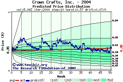 The high to date and low to date prices of the stock plotted against a random walk model for 2004 (what's this?).