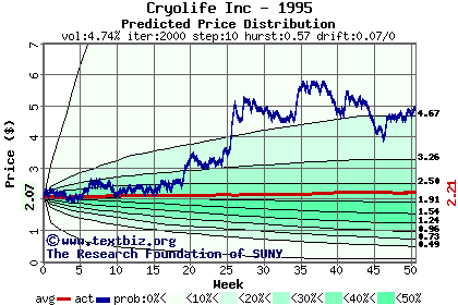 The high to date and low to date prices of the stock plotted against a random walk model for 1995 (what's this?).