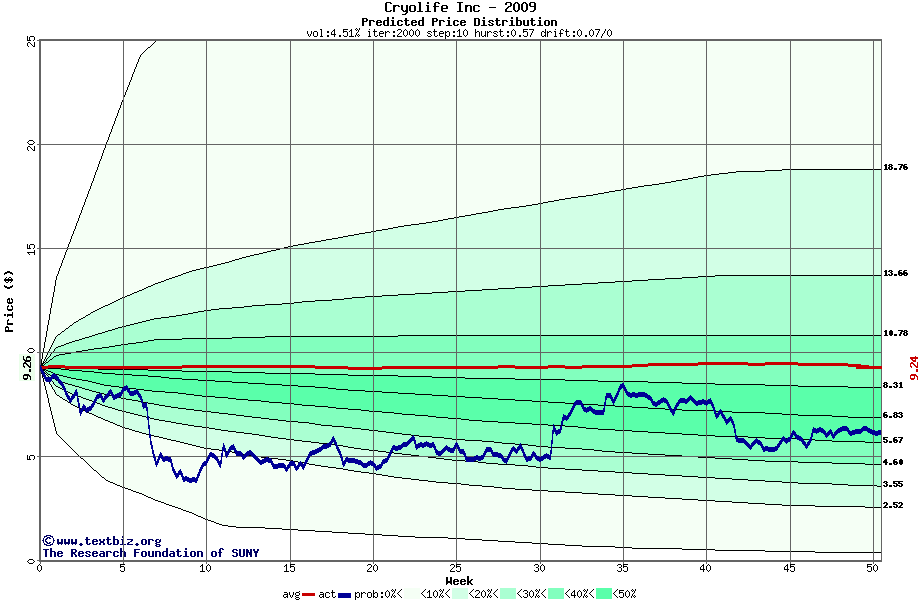 The following graph plots the year-to-date performance of the stock for 2009 compared to the probability calculated by a random walk model.