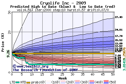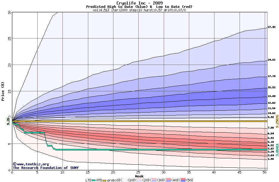 The high to date and low to date prices of the stock plotted against a random walk model for 2009 (what's this?).