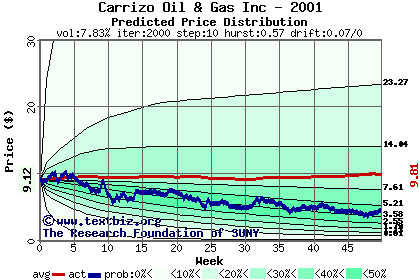 The high to date and low to date prices of the stock plotted against a random walk model for 2001 (what's this?).