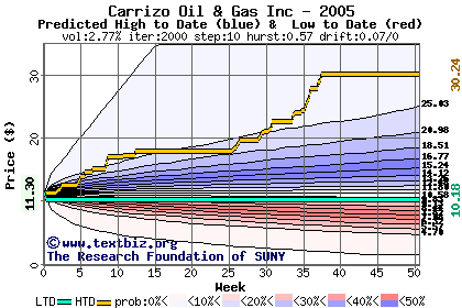 The high to date and low to date prices of the stock plotted against a random walk model for 2005 (what's this?).