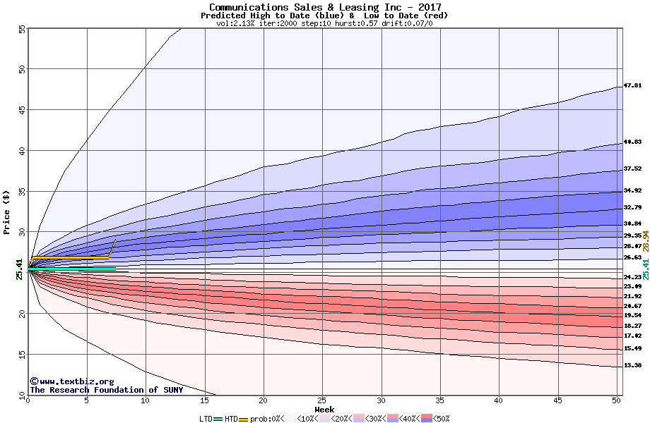 The high to date and low to date prices of the stock plotted against a random walk model for 2017 (what's this?).