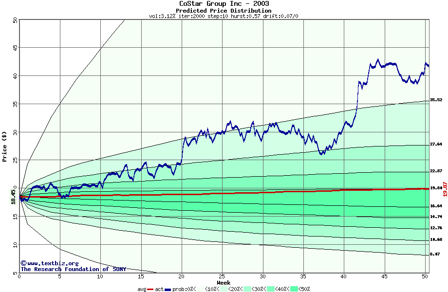 The following graph plots the year-to-date performance of the stock for 2003 compared to the probability calculated by a random walk model.