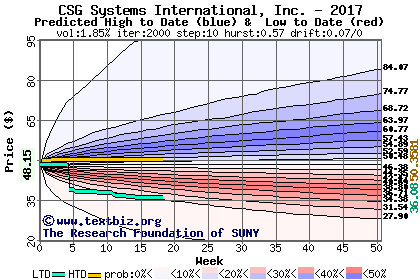 The high to date and low to date prices of the stock plotted against a random walk model for 2017 (what's this?).
