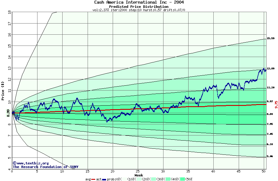 The following graph plots the year-to-date performance of the stock for 2004 compared to the probability calculated by a random walk model.