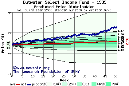 The high to date and low to date prices of the stock plotted against a random walk model for 1989 (what's this?).