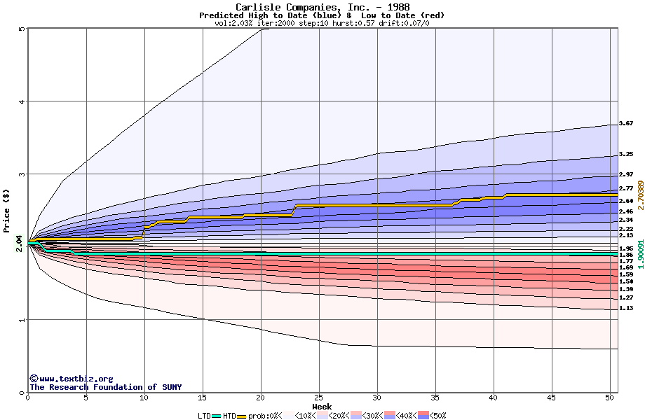 The high to date and low to date prices of the stock plotted against a random walk model for 1988 (what's this?).