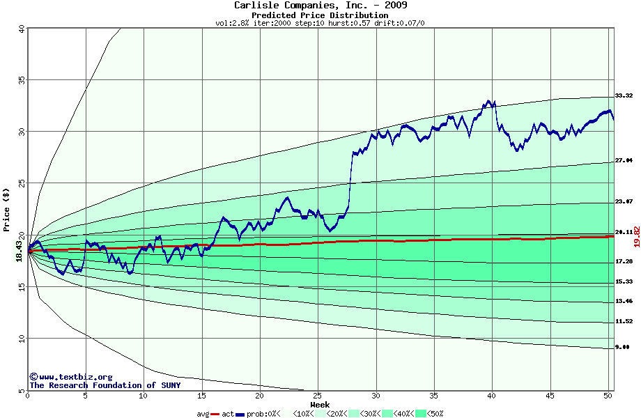The following graph plots the year-to-date performance of the stock for 2009 compared to the probability calculated by a random walk model.