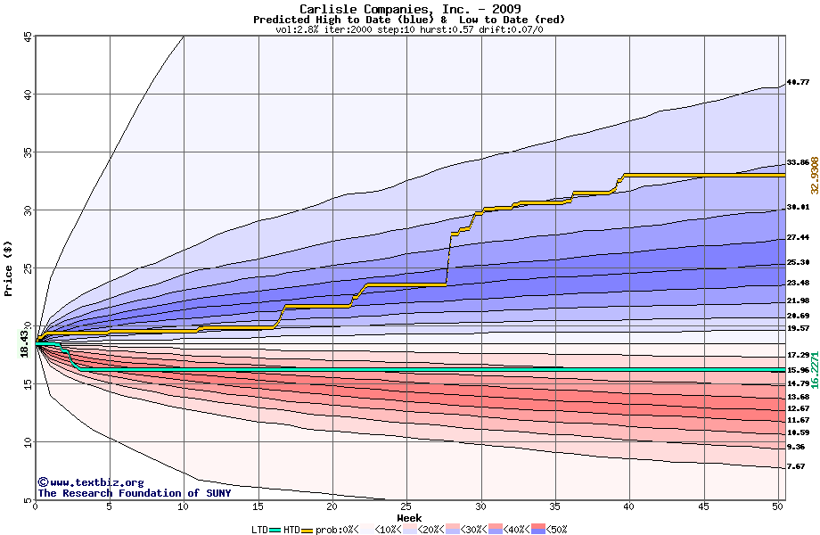 The high to date and low to date prices of the stock plotted against a random walk model for 2009 (what's this?).