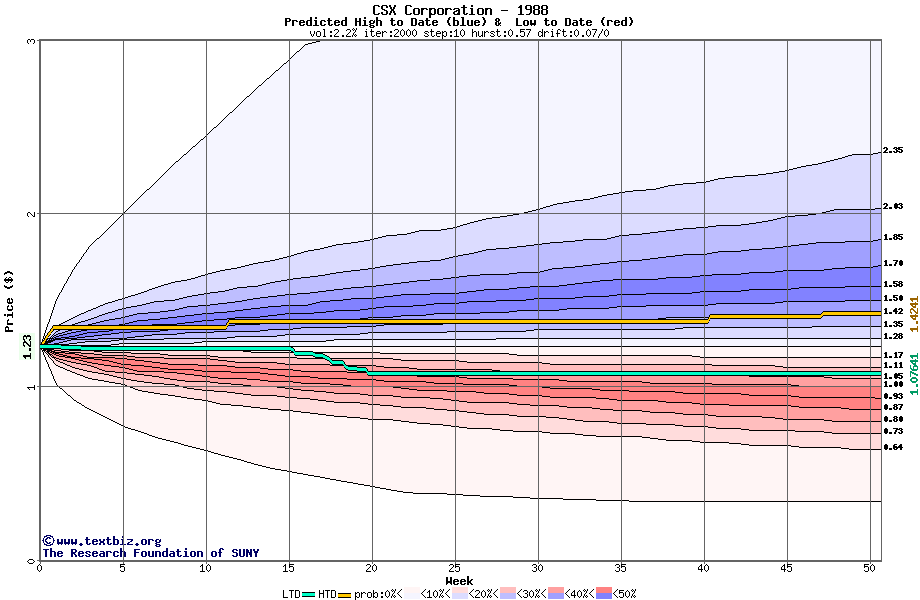 The high to date and low to date prices of the stock plotted against a random walk model for 1988 (what's this?).