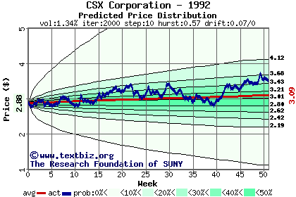 The following graph plots the year-to-date performance of the stock for 1992 compared to the probability calculated by a random walk model.