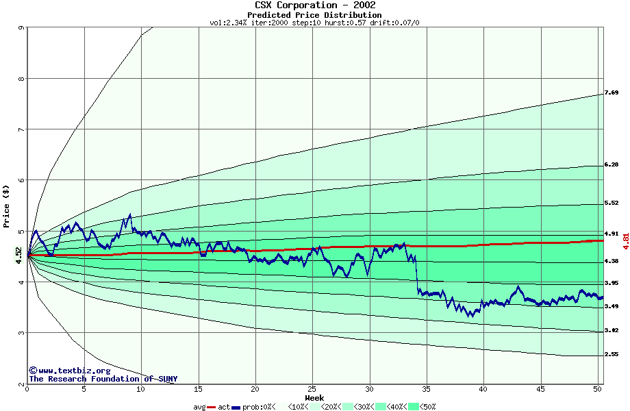 The following graph plots the year-to-date performance of the stock for 2002 compared to the probability calculated by a random walk model.