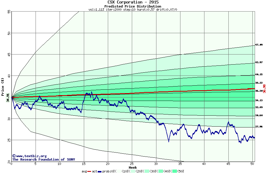 The following graph plots the year-to-date performance of the stock for 2015 compared to the probability calculated by a random walk model.