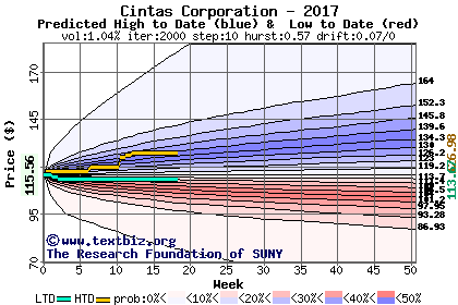 The high to date and low to date prices of the stock plotted against a random walk model for 2017 (what's this?).