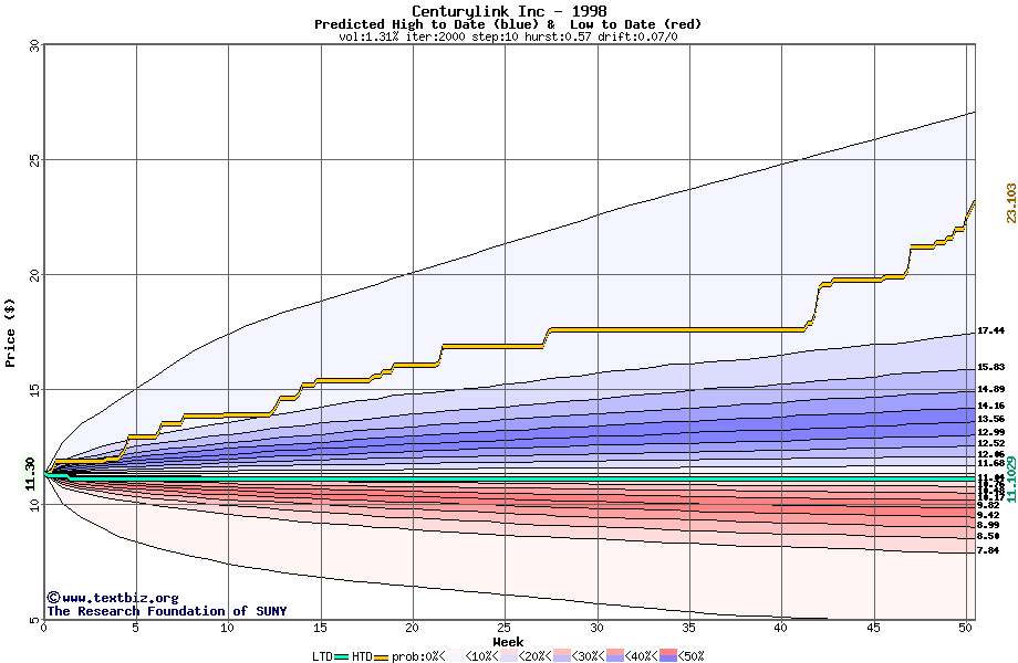 The high to date and low to date prices of the stock plotted against a random walk model for 1998 (what's this?).