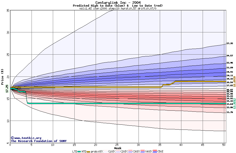 The high to date and low to date prices of the stock plotted against a random walk model for 2004 (what's this?).