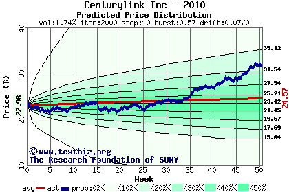 The high to date and low to date prices of the stock plotted against a random walk model for 2010 (what's this?).