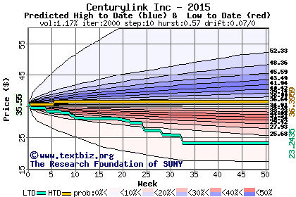 The high to date and low to date prices of the stock plotted against a random walk model for 2015 (what's this?).