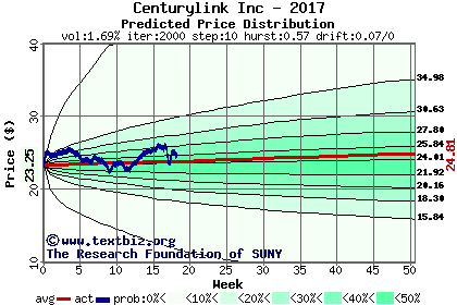 The high to date and low to date prices of the stock plotted against a random walk model for 2017 (what's this?).