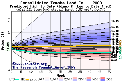 The high to date and low to date prices of the stock plotted against a random walk model for 2000 (what's this?).