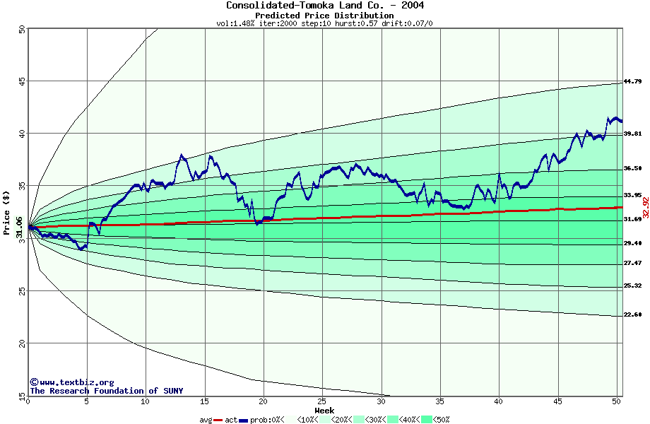 The following graph plots the year-to-date performance of the stock for 2004 compared to the probability calculated by a random walk model.