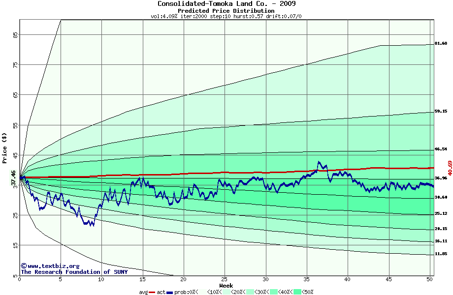 The following graph plots the year-to-date performance of the stock for 2009 compared to the probability calculated by a random walk model.