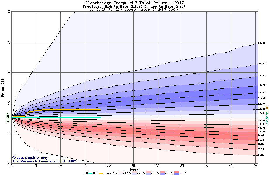 The high to date and low to date prices of the stock plotted against a random walk model for 2017 (what's this?).