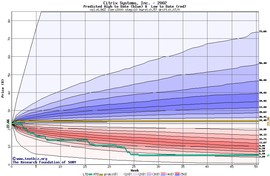 The high to date and low to date prices of the stock plotted against a random walk model for 2002 (what's this?).
