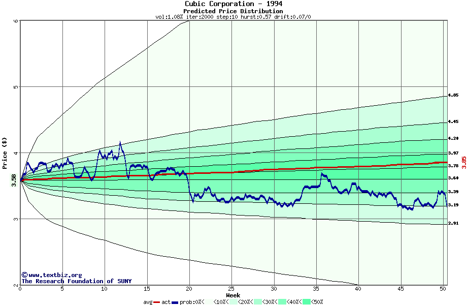 The following graph plots the year-to-date performance of the stock for 1994 compared to the probability calculated by a random walk model.