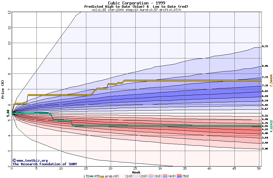 The high to date and low to date prices of the stock plotted against a random walk model for 1999 (what's this?).