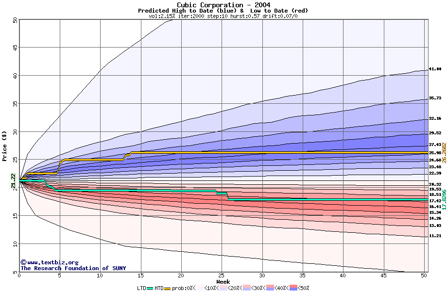 The high to date and low to date prices of the stock plotted against a random walk model for 2004 (what's this?).