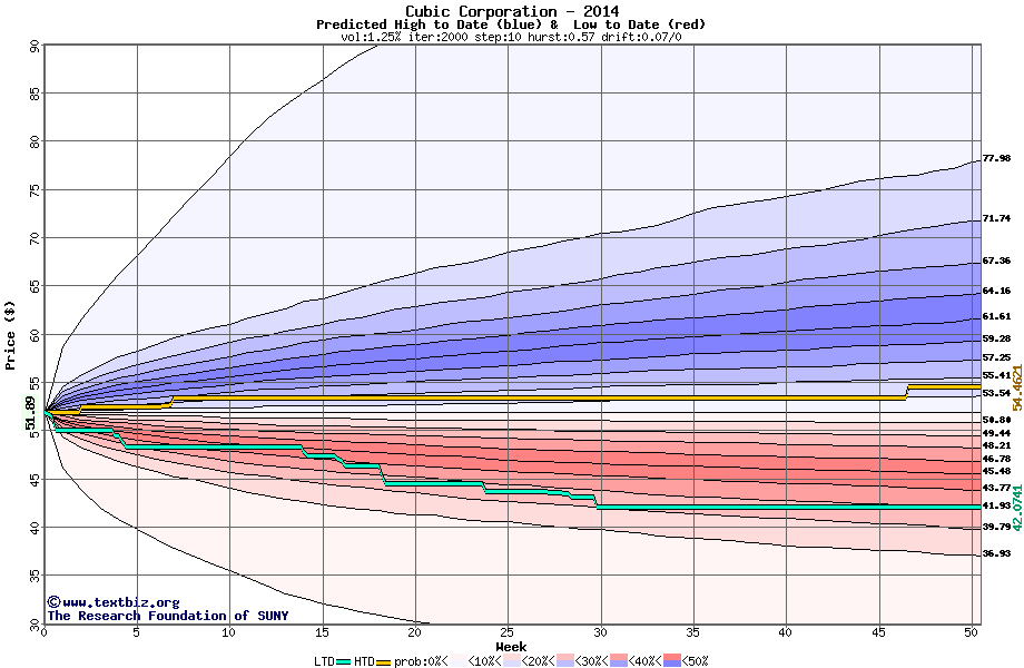 The high to date and low to date prices of the stock plotted against a random walk model for 2014 (what's this?).