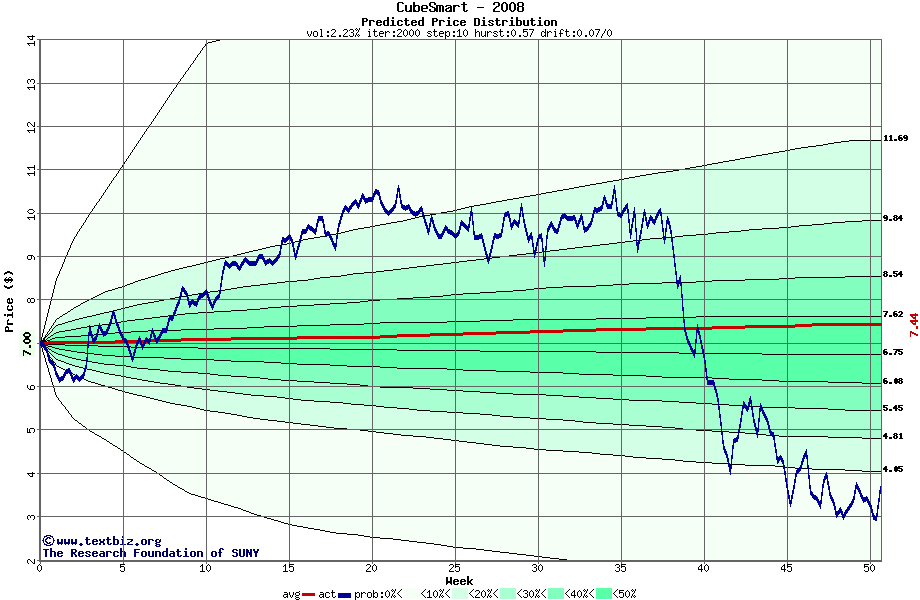 The following graph plots the year-to-date performance of the stock for 2008 compared to the probability calculated by a random walk model.