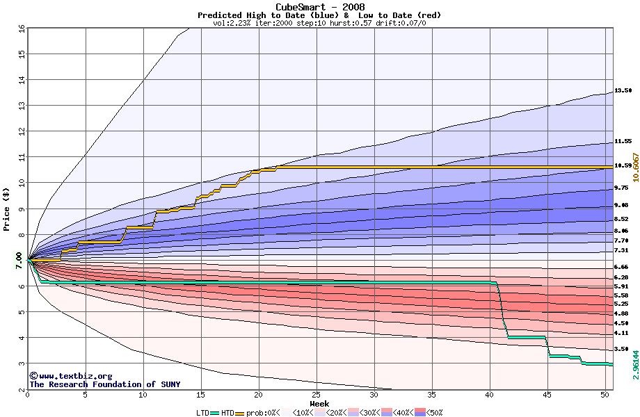 The high to date and low to date prices of the stock plotted against a random walk model for 2008 (what's this?).